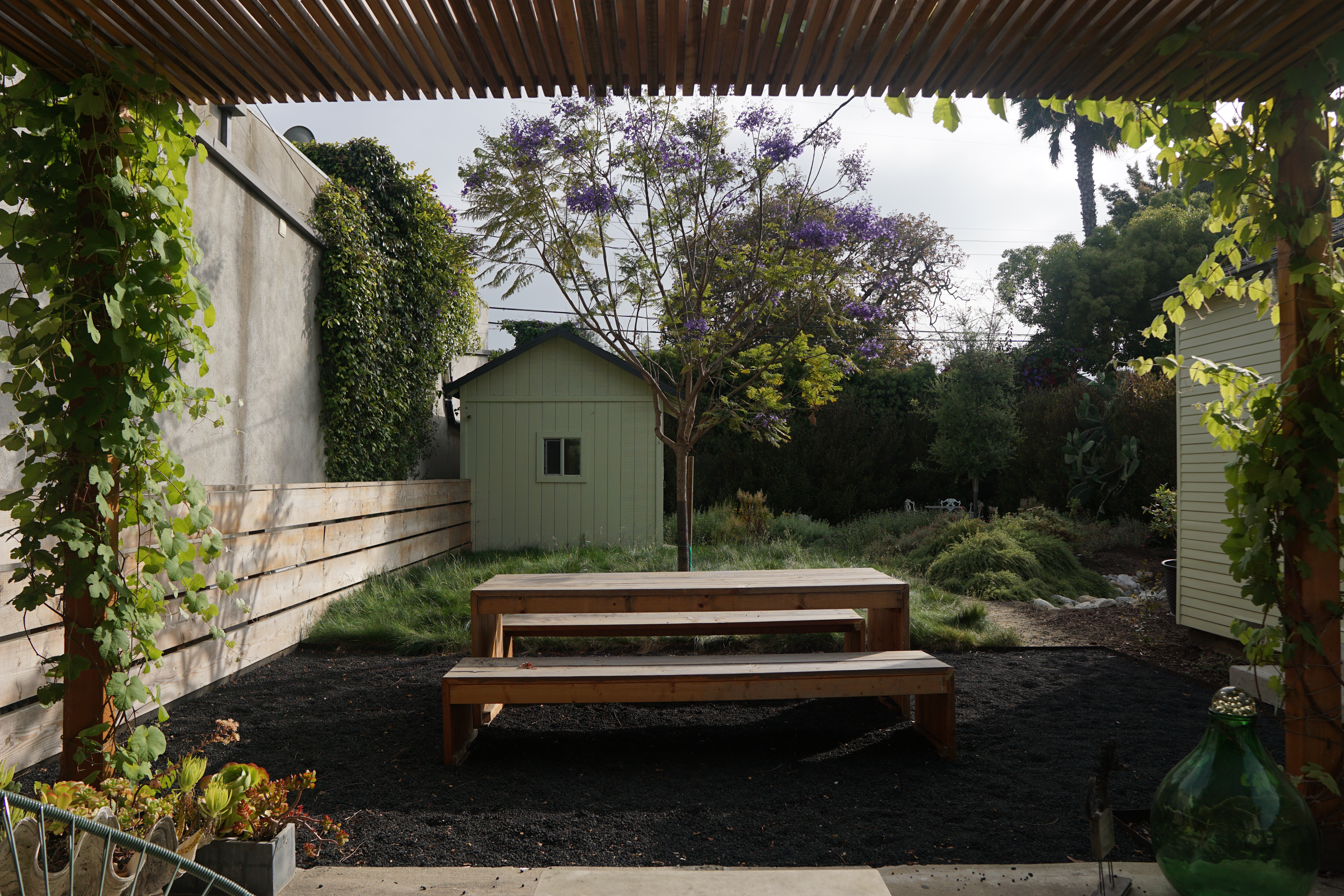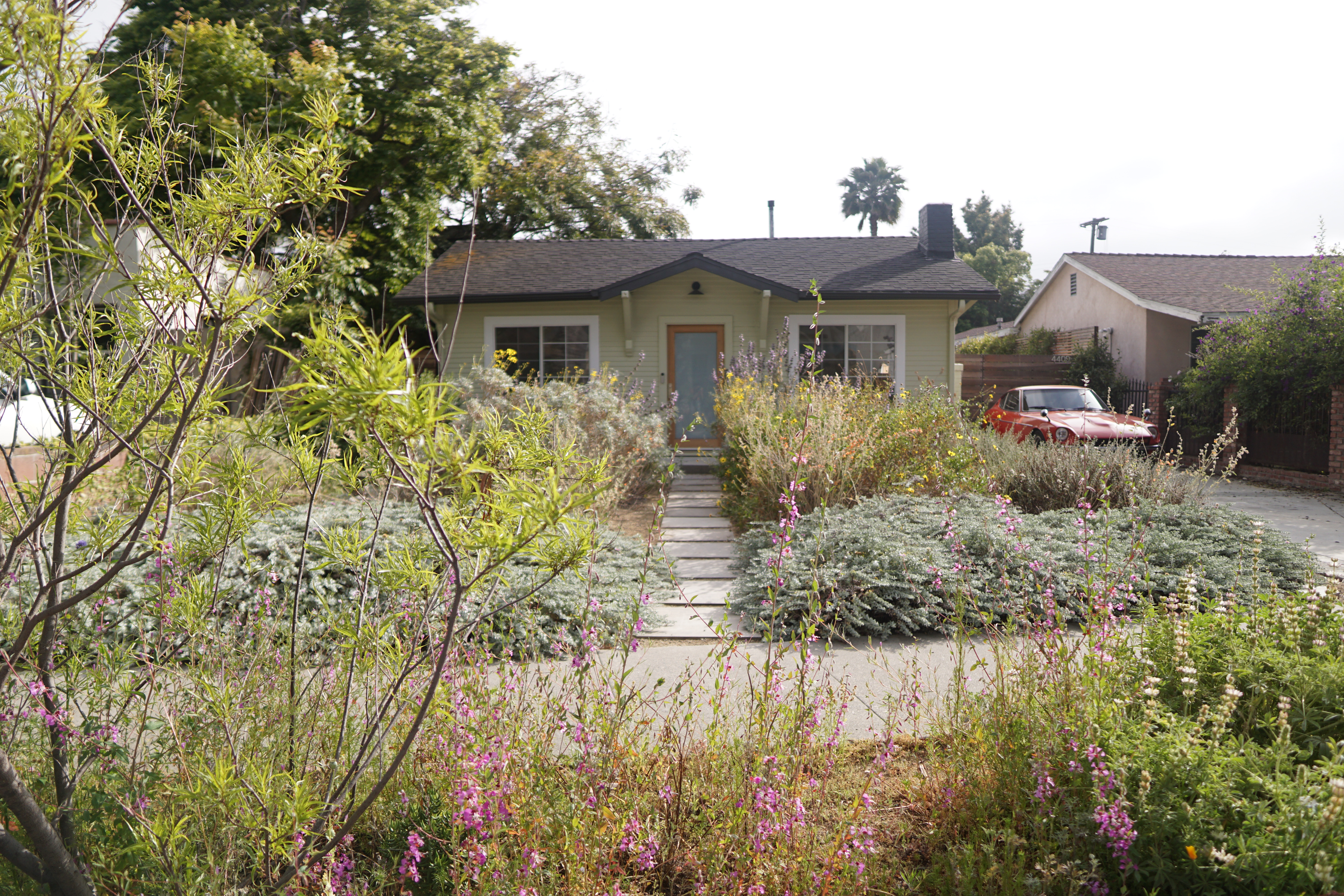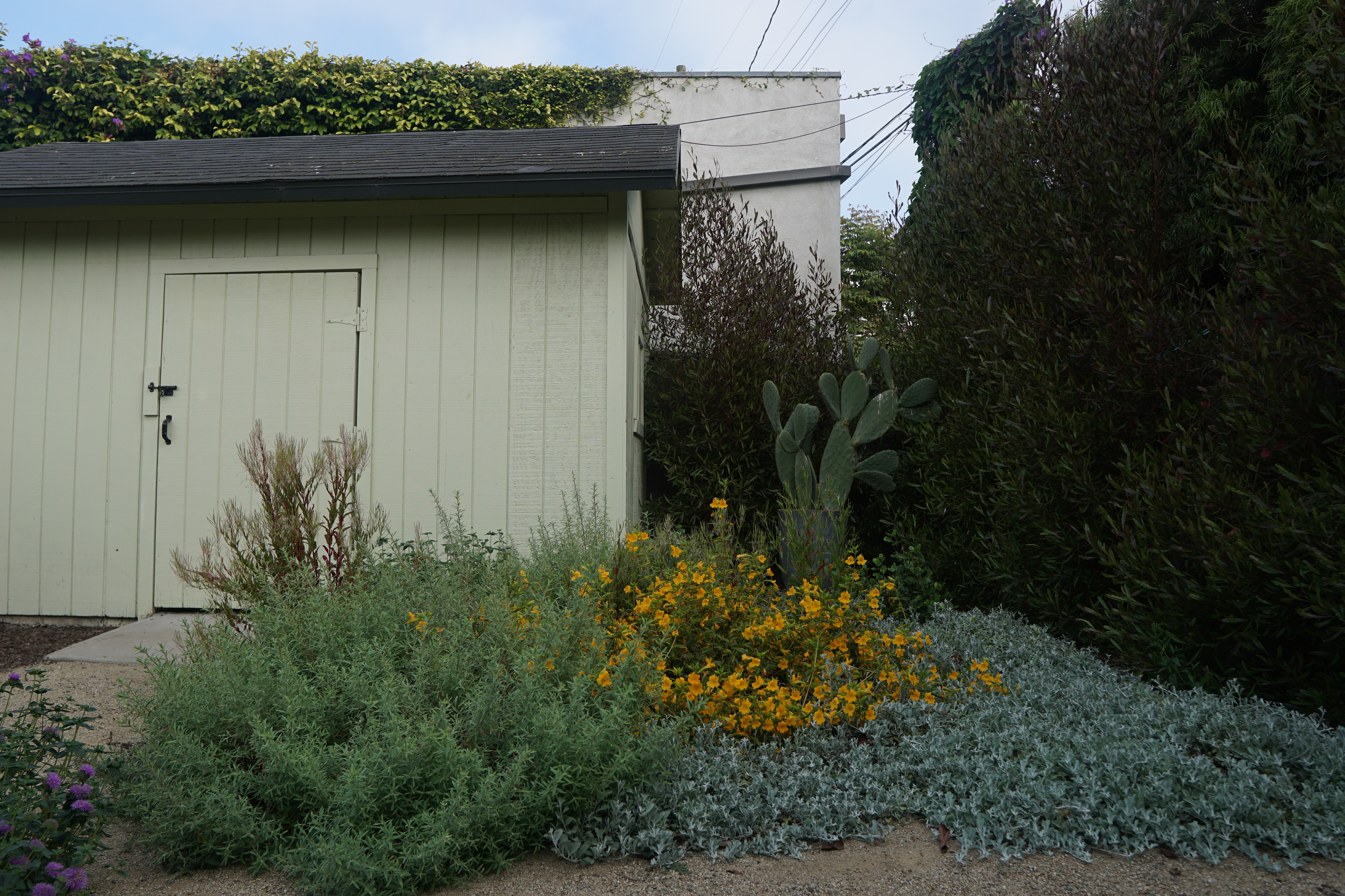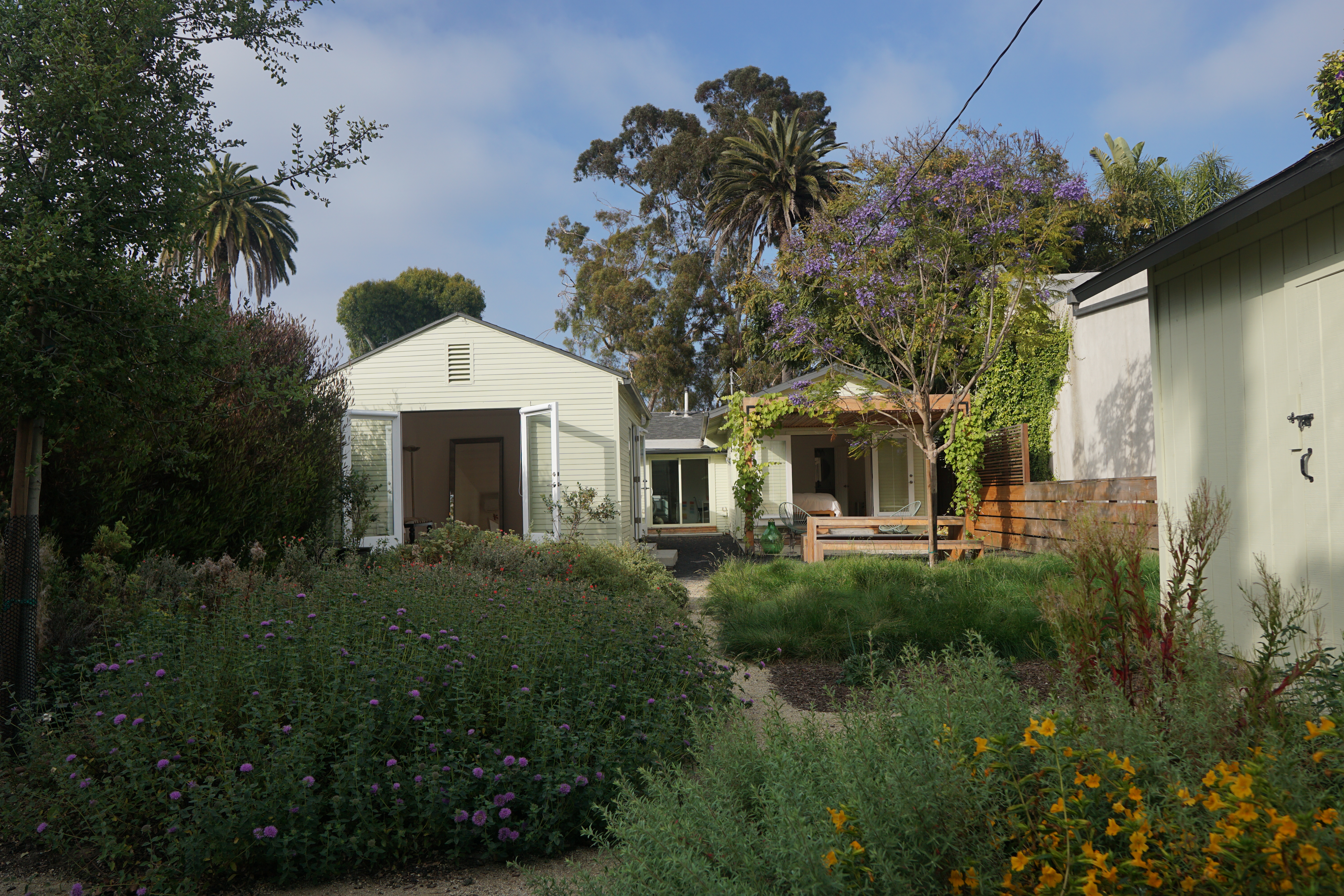 We designed our ‘Chateau Chaparral’ garden to be a wild, colorful, deliciously aromaed coastal mountain living habitat. The goal was to create a habitat for native insects, butterflies, and birds, providing each plant with enough space and nutrients so they can thrive into one collaborative native plant mass to support life. For the humans, there are intentional spaces of rest and relaxation to facilitate enjoyment of the shade, smells, sounds, and visual beauty of the garden. Our aim was to create a calming oasis of relaxation, where animals and humans can find respite and replenishment from the bustling city environment.